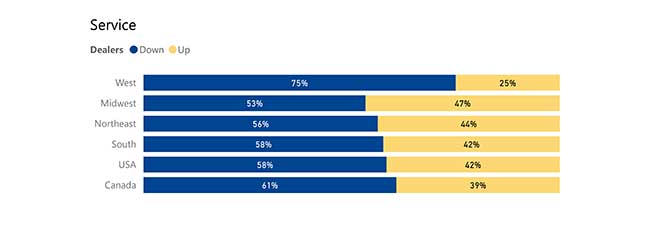 Dealers in the Midwest fared best on strong wholegoods sales which were up 23% compared to August 2024. Wholegoods sales by dealers in the West and Northeast, however, were down 11%, comparing August 2025 to August 2024. Service activity was down nationwide, except for at dealers in the Northeast.