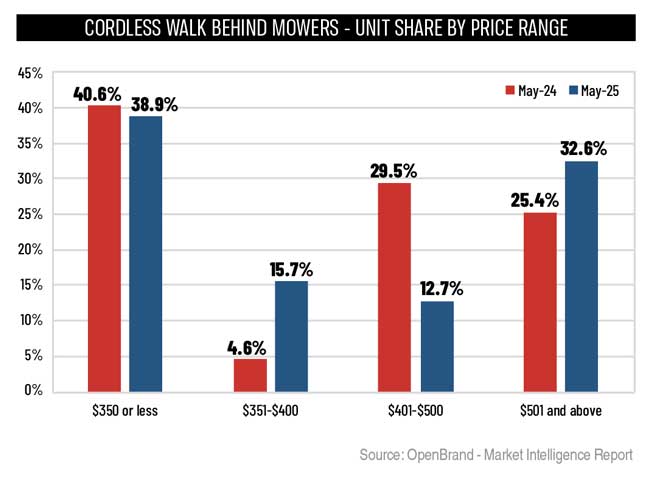 Market research firm OpenBrand shared with OPE+ its consumer research around walk-behind mowers, looking specifically at brands, sales, pricing and product types. OpenBrand collected this data from online and in-store sources across its retailer panel during the month of May 2025, a big month for homeowners to purchase new lawnmowers. The retailer panel includes HomeDepot, Lowe’s, Walmart, Amazon and Best Buy. (Yes, I was surprised, too, to learn that Best Buy sells lawnmowers, including battery-powered models from Greenworks, Worx and others, plus robotic mowers from Mammotion).