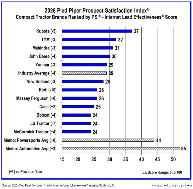 Dealerships representing Kubota ranked highest in the 2026 Pied Piper PSI Internet Lead Effectiveness Compact Tractor Industry Study, which measured how quickly and thoroughly dealers responded to online sales inquiries. Kubota dealers averaged an Internet Lead Effectiveness, or ILE, score of 37 out of 100. The overall industry average was 29.