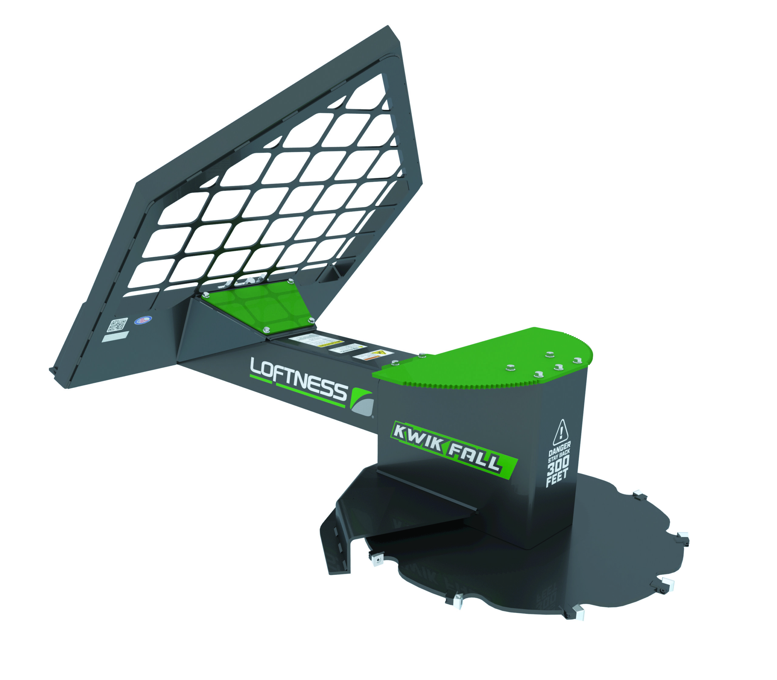 The Kwik Fall tree saw is designed for fast removal of invasive trees. Available for both standard-flow and high-flow skid steers, the attachment features a large cutting disc with replaceable carbide teeth designed to cut through trees up to 14 inches in diameter. An integrated deflector protects the cab and helps guide falling material toward the ground.